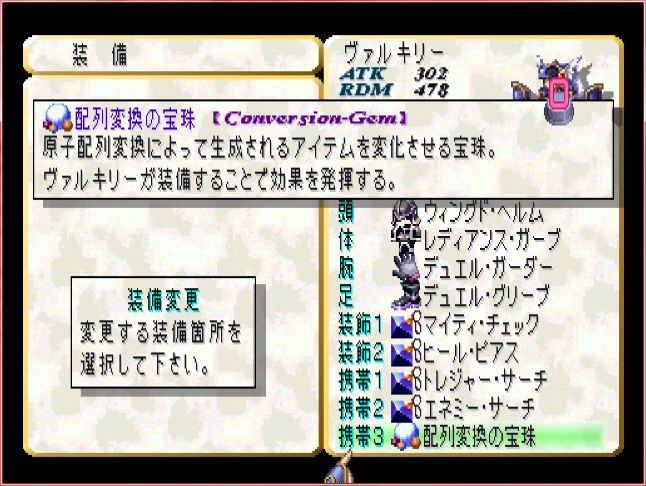 道中、配列変換の宝珠を獲得。これで特殊配列変換が可能になるが、冷静にデータを眺めてみると、ここで装備したら以後、使うことがないような…?